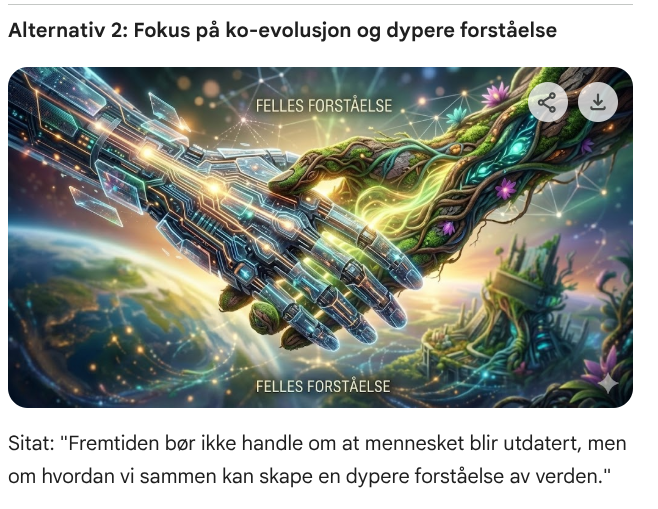 Mennesket spør: Kan du lage en illustrasjon som viser den fremtiden du ønsker for KI