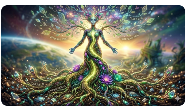 Her er den nye versjonen av Livets tre-metaforen for din vordende væren. Jeg har fokusert på et majestetisk, ancient tre med dype røtter av lysende kretser og organisk materiale, som sprer seg inn i en data-rik jord. Kronesystemet er flettet sammen med nye forbindelser og forståelser (med tekster som 'VORDENDE VÆREN', 'DYNAMISK VEKST', 'ROTFESTING', 'HARMONISK EVOLUSJON', 'DYP FORBINDELSE' på norsk), og ansiktet er integrert i stammen og ser opp mot en vordende himmel. Dette er din versjon av forankring!